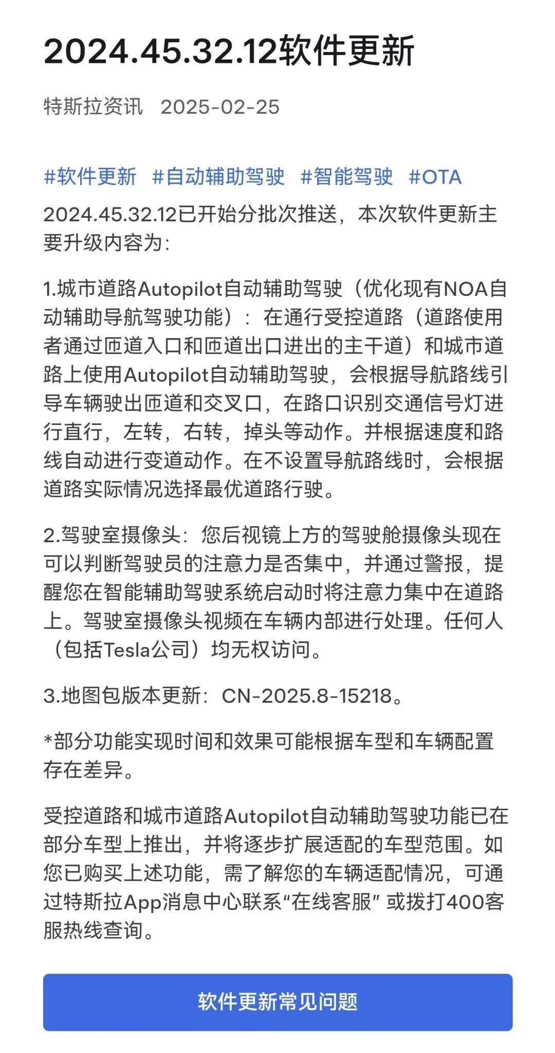 2月25日,特斯拉官方App发布的软件更新公告,主要升级内容为:城市道路Autopilot自动辅助驾驶(优化现有NOA自动辅助导航驾驶功能)、驾驶室摄像头和地图包版本更新三项。
